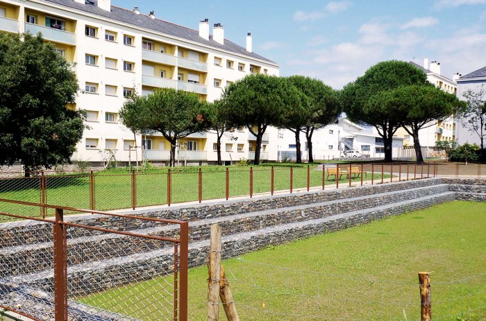 A l’est, entre les collectifs aux coursives envahies de plantes grimpantes, les façades sud et leurs terrasses s’ouvrent sur un espace paysager engazonné. Les terrasses du rez-de-chaussée sont protégées par une haie variée et fleurie, des pas japonais permettent de rejoindre sa terrasse en passant par cette espace. Au pied de la façade nord, une noue douce et plantée d’arbustes et d’arbres à port étroit assurent un fond de plan verdoyant depuis les logements et limitent fortement les co-visibilités vers les terrasses et balcons des logements.