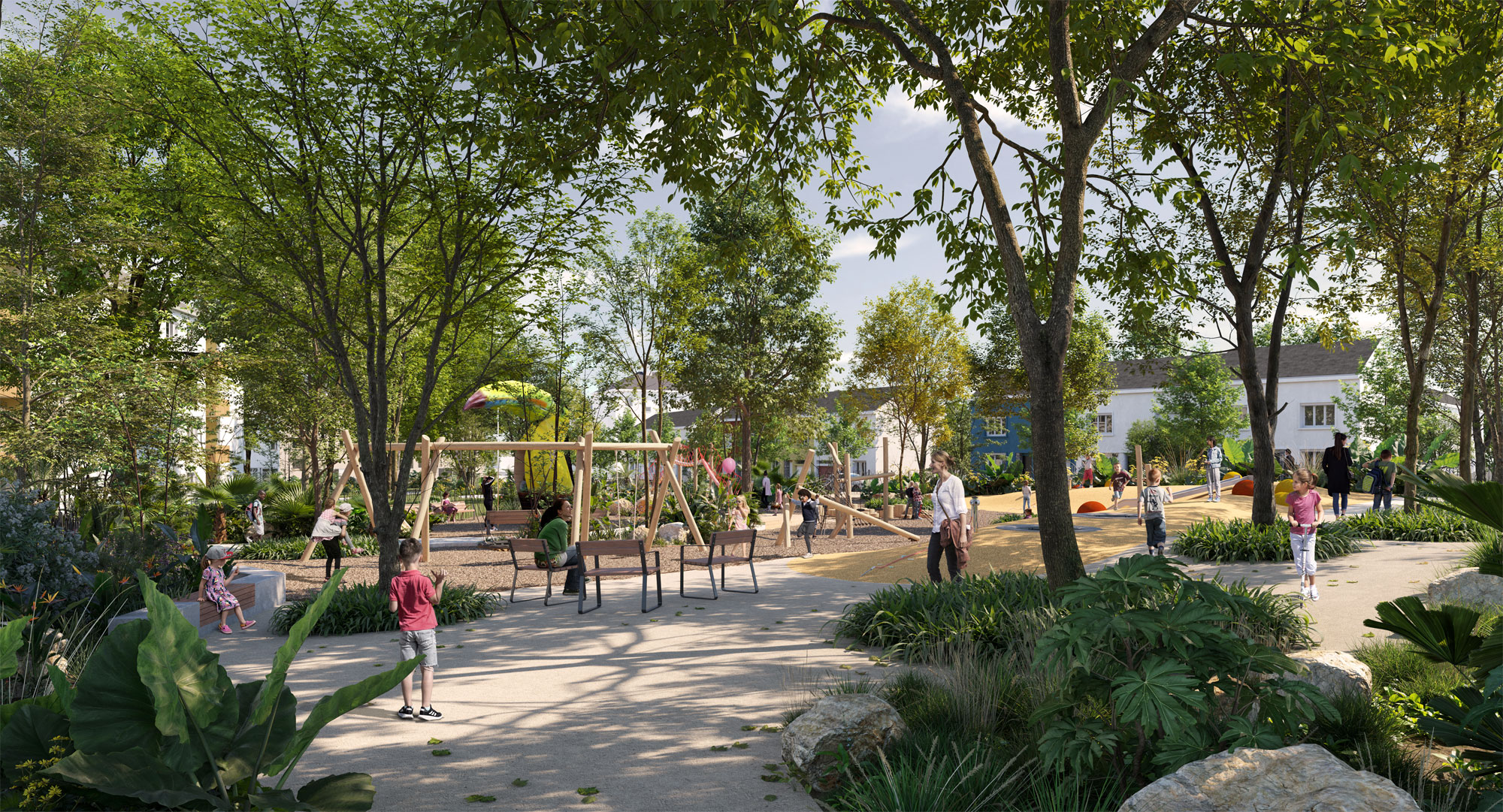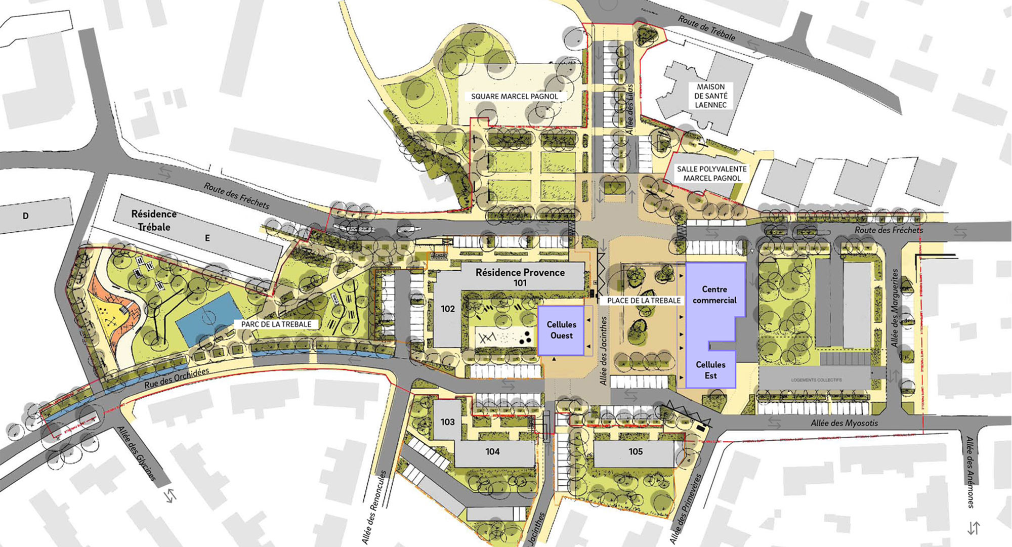 Mission réalisée : Maîtrise d’œuvre pour la restructuration du centre commercial de la Trébale et aménagement des espaces publics – Secteur Parc public