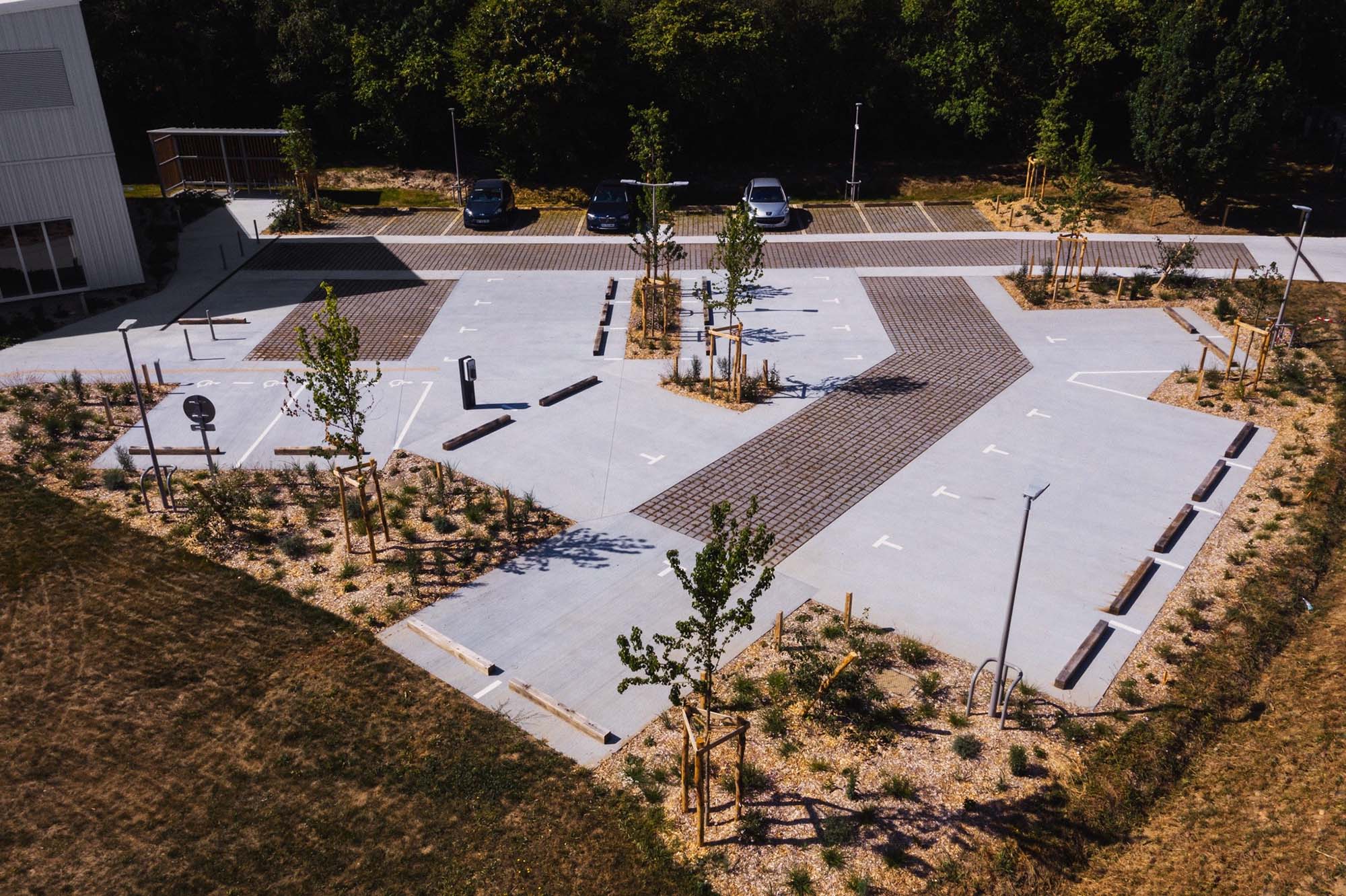 A l’ouest, l’entrée personnel et visiteur est implantée dans la pente existante par poches successives. Généreusement planté de massifs afin de dissimuler les véhicules, le parking est également arboré dans le but d’étirer le boisement existant en premier plan.