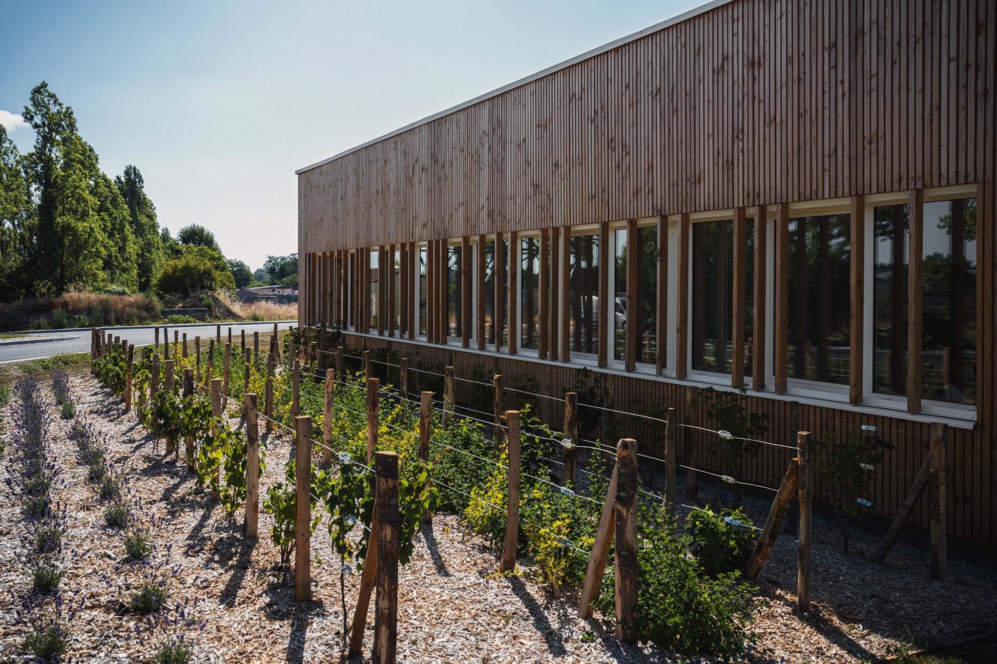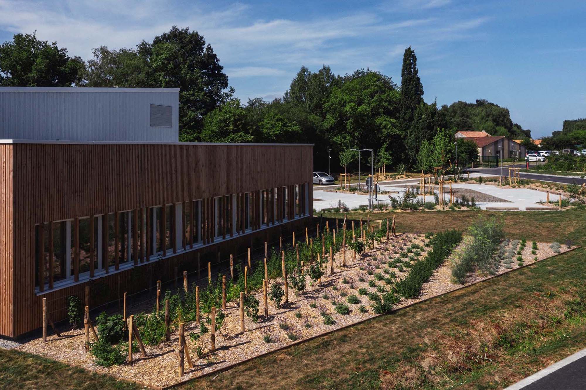 Par le retrait du bâti sur la parcelle, l’îlot offre une perspective agréable et ouverte sur le boulevard Auguste Priou. Depuis celui-ci et dans la continuité visuelle vers la cuisine centrale, des bandes végétales d’essences aromatiques sont installées, non sans rappeler l’imaginaire des cultures.
