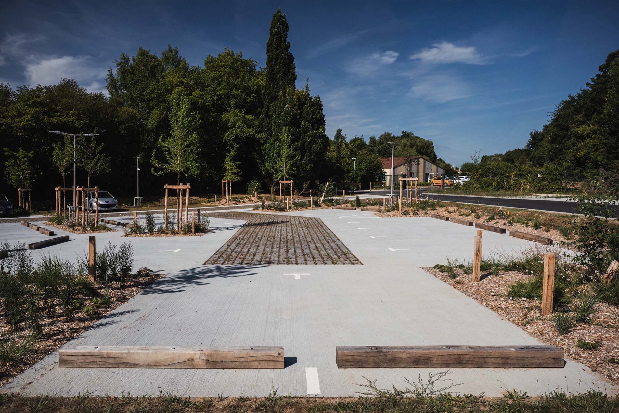 Des plantations hygrophiles occupent le bassin de rétention des eaux pluviales en fond de parcelle. Des essences d’arbres adaptées à ces conditions ponctuent alors la pente dans la continuité des boisements existants.